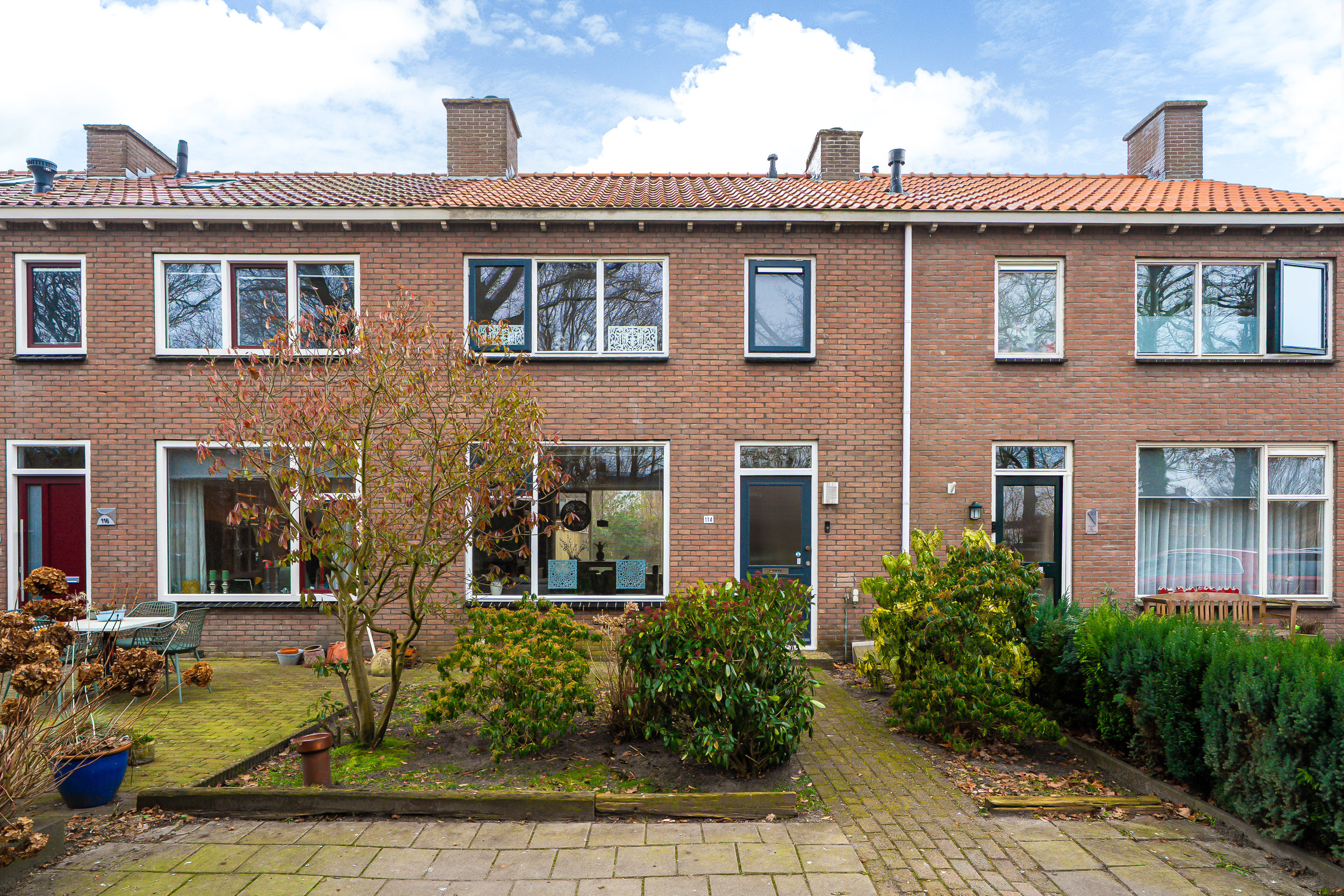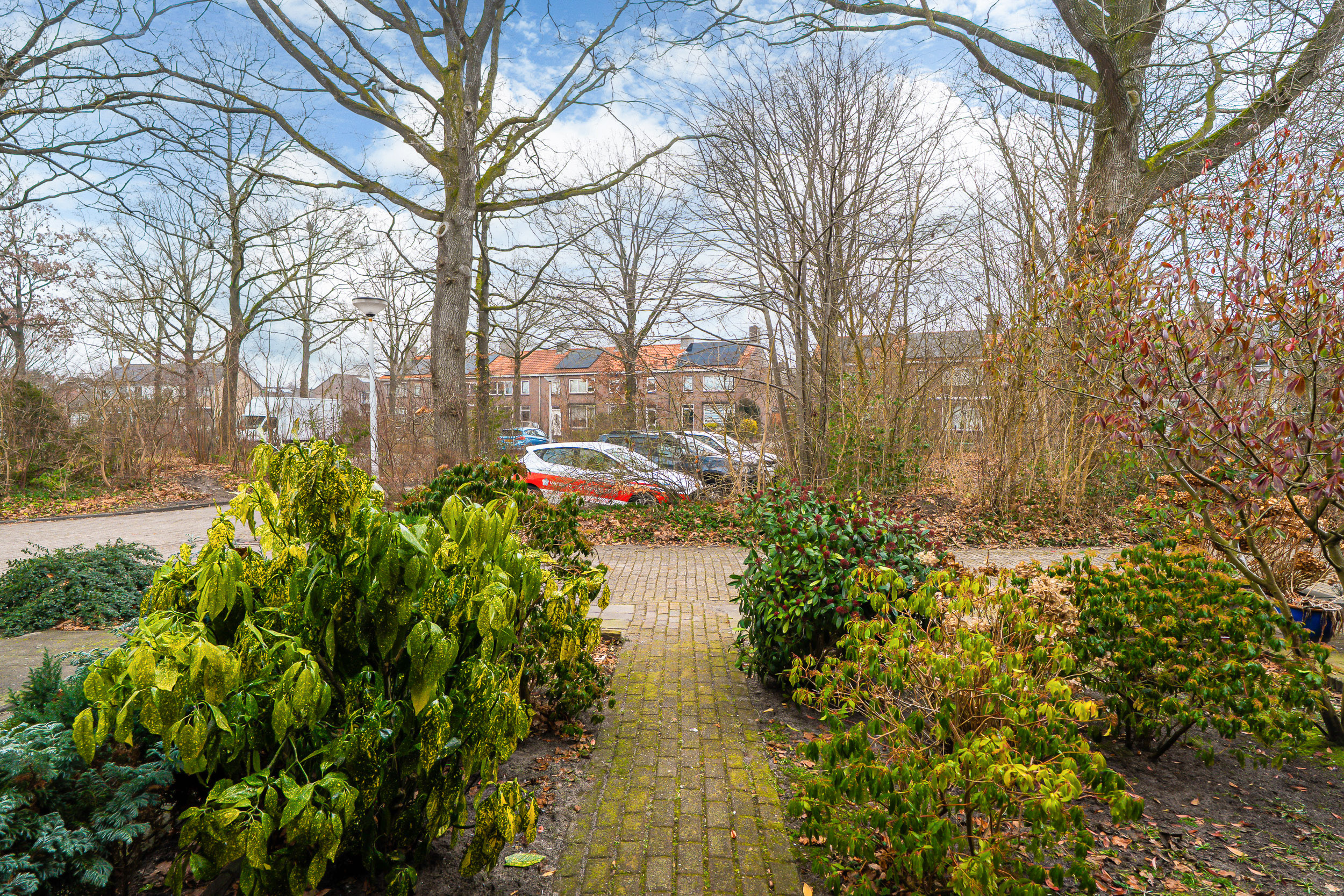 - Groene voorzijde met voetpad en parkeerterrein