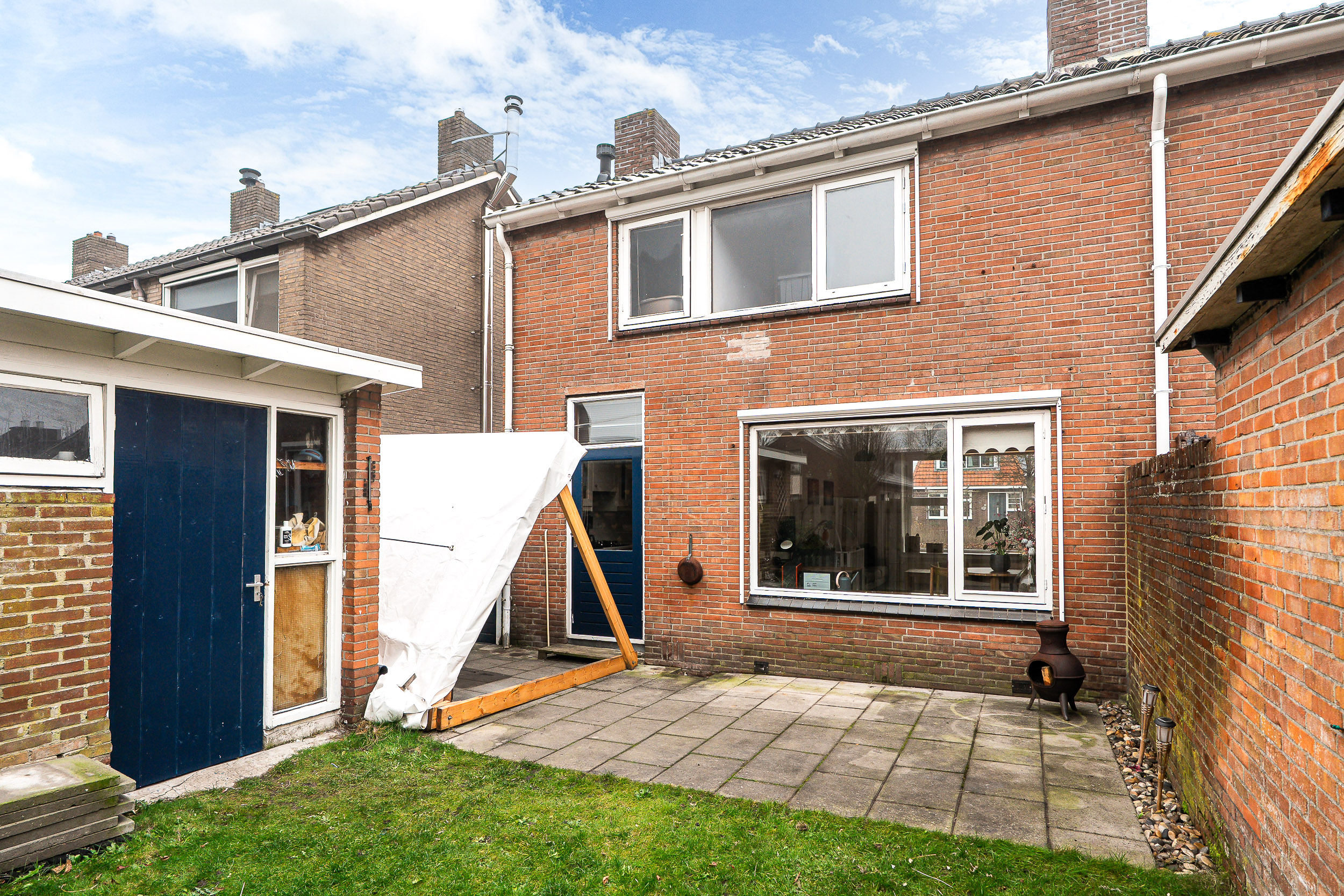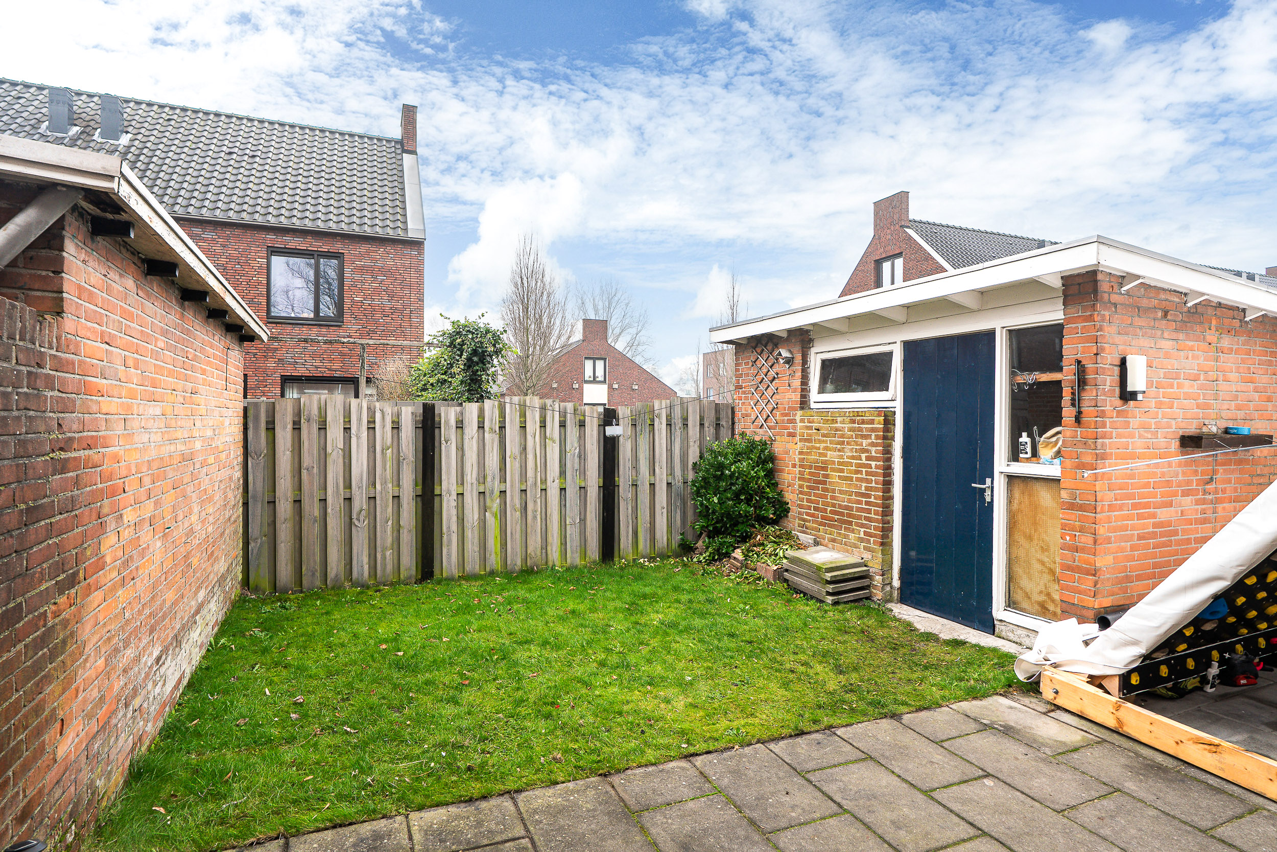 Rondom de woning ligt een voor- en achtertuin. Achterin staat een vrijstaande stenen berging, perfect voor fietsen, gereedschap of hobbyspullen. Dankzij de overdekte zijsteeg heb je altijd een droge achterom en desgewenst kan er zelfs een tweede achterom worden gerealiseerd.