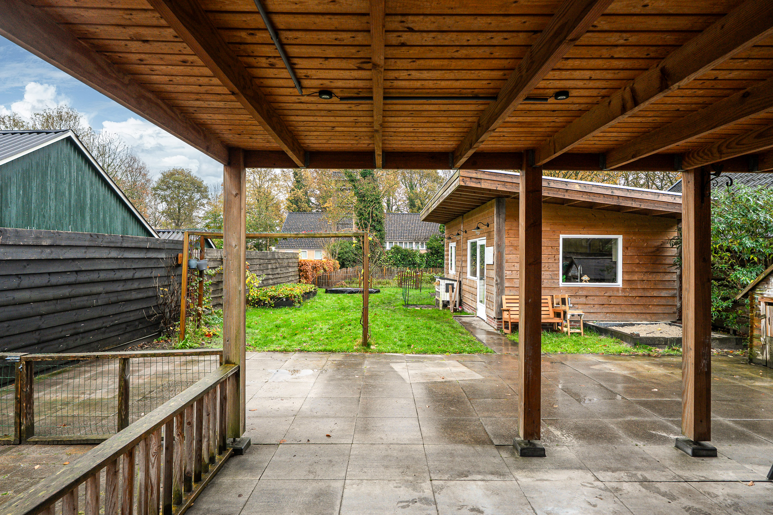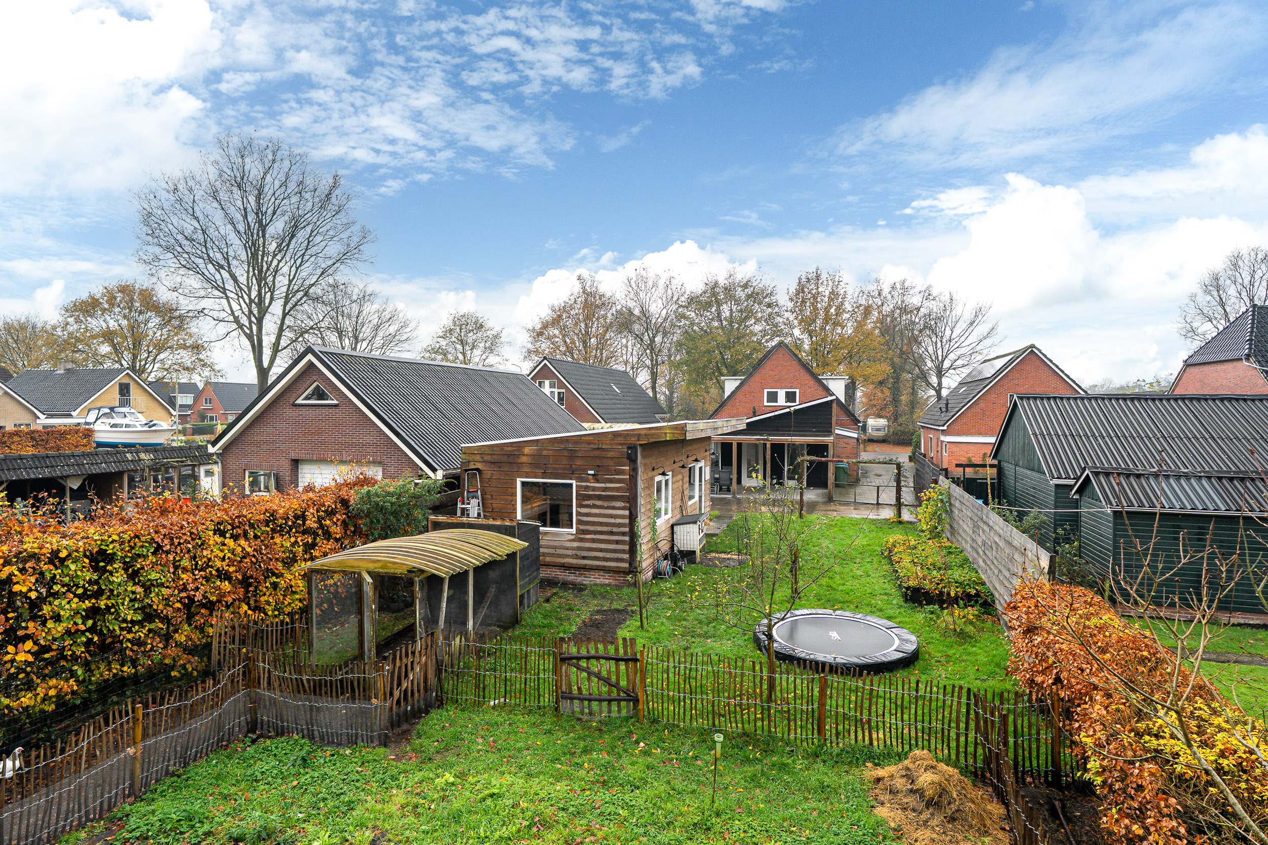 Aan beide kanten van het huis kun je achterom komen. Aan de ene kant via een pad, aan de andere kant over de gedeelde oprit. Beide zijn verhard. voortuin heeft gras en vaste planten/heesters, de achtertuin is heel gevarieerd en door de vele vierkante meters geschikt voor allerlei functies. Aan de bijkeuken is een royale overkapping gebouwd. Een fijn plekje dat buiten en binnen met elkaar verbindt. Zo kun je in ieder seizoen lekker buiten zitten: beschut tegen warmte, regen, kou en wind. De achtertuin bestaat verder uit gras, moestuin en een plek voor de kippen. Kinderen hebben er de ruimte om te spelen en je kunt natuurlijk ook een siertuin aanleggen. In de moestuin is de vorst inmiddels over de boerenkool geweest, dus die is klaar voor de stamppot!